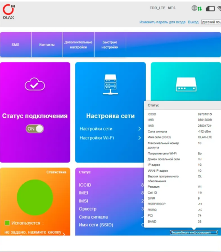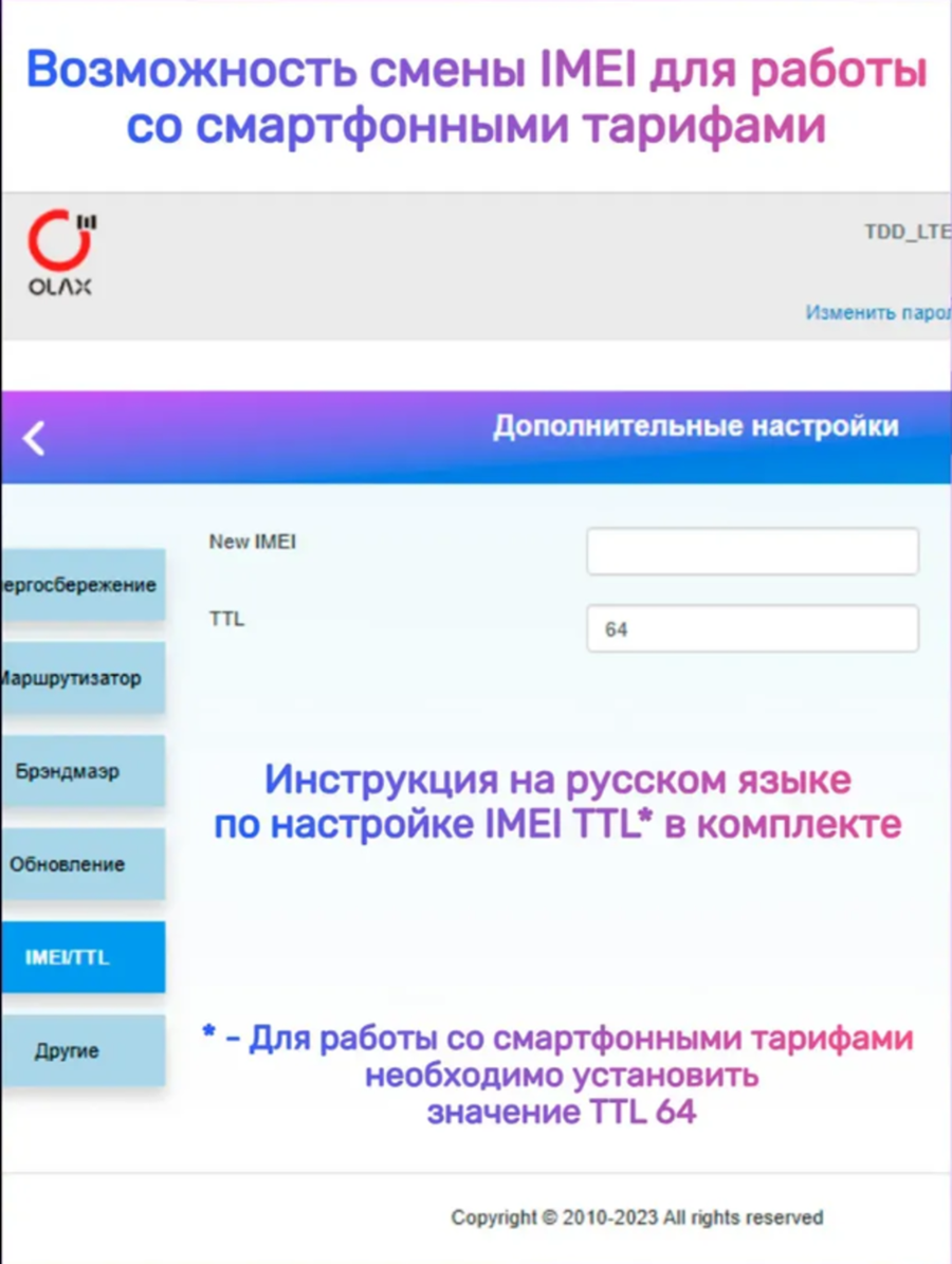 Модем имеет самую актуальную и стабильную версию прошивки, меню на русском языке, расширенный функционал web-интерфейса с возможностью выбора частот и диапазонов сети, настройки IMEI / TTL!