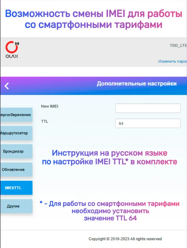 - настройки параметров IMEI TTL в веб-интерфейсе модема (можно настроить практически под любой тариф)